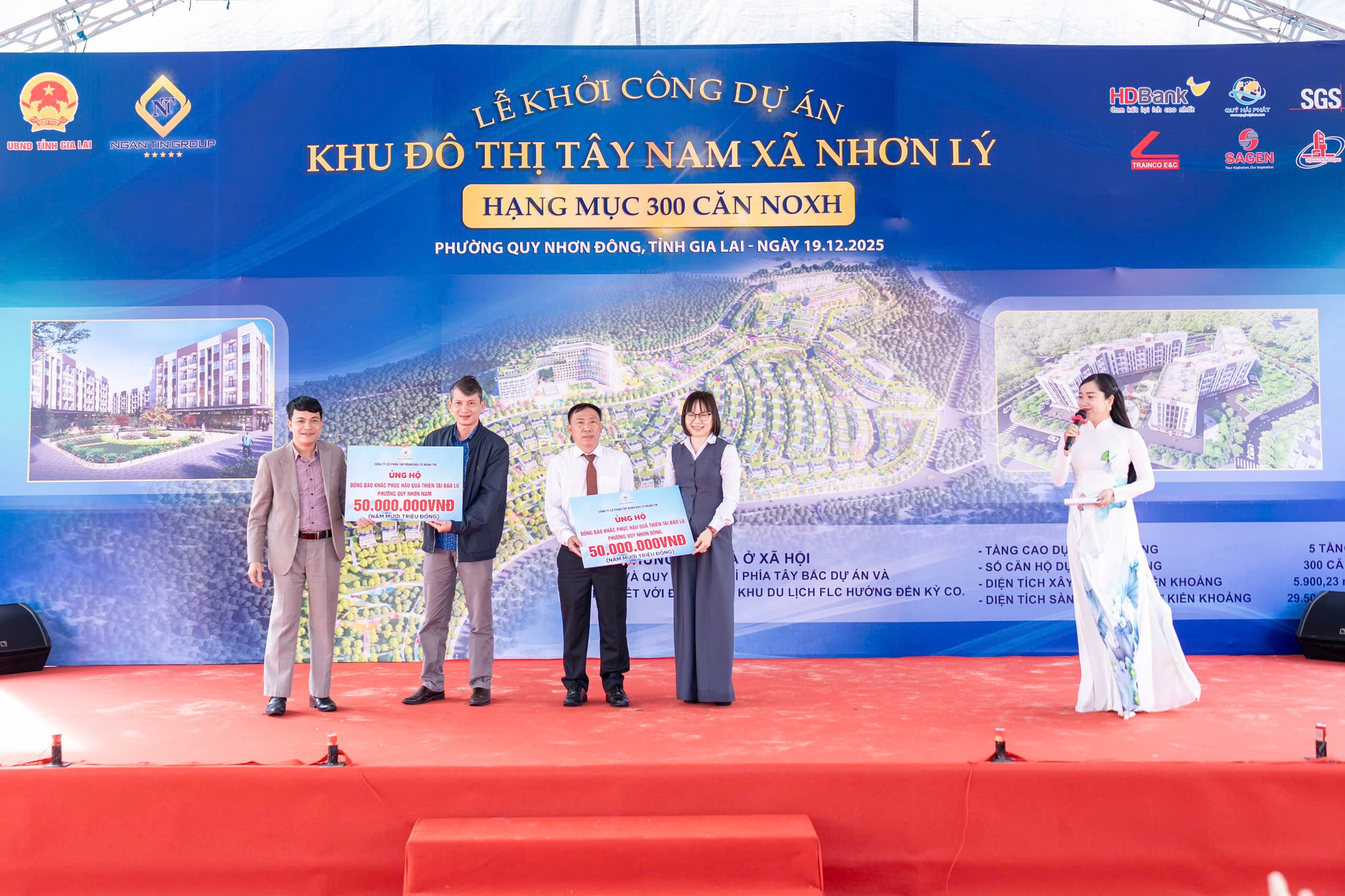 Đại diện Lãnh đạo Tập đoàn Ngân Tín trao quà ủng hộ bà con nhân dân bị ảnh hưởng bởi bão lũ 2 phường Quy Nhơn Nam và Quy Nhơn Đông tại sự kiến Lễ Khởi Công Dự án KĐT Tây Nam Xã Nhơn Lý được tổ chức ngày 19/12/2025 tại Gia Lai