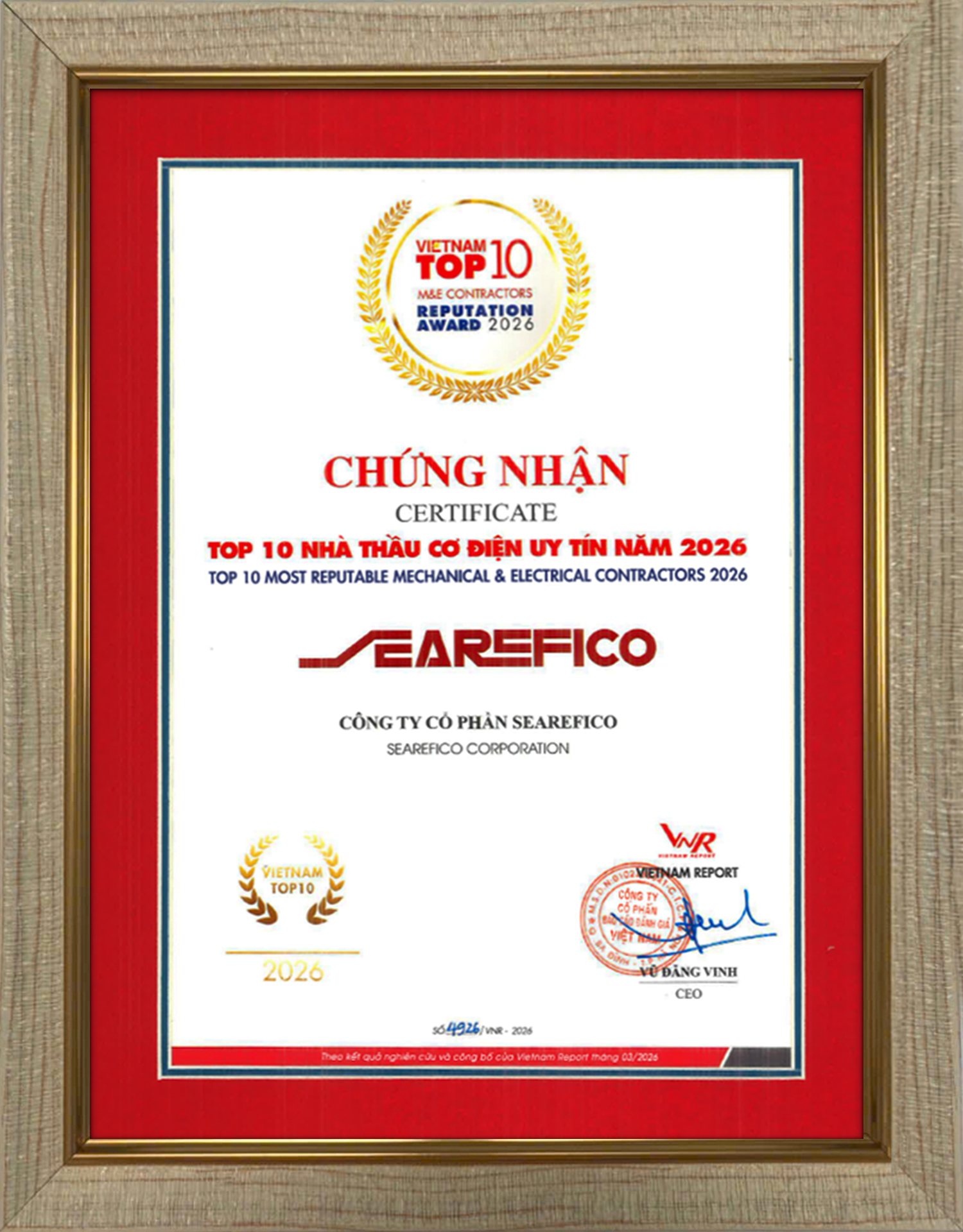Tiếp nối hành trình khẳng định thương hiệu nhiều năm liên tiếp trong bảng xếp hạng, Searefico E&C năm nay đã tạo nên một "cú lội ngược dòng" ngoạn mục. Từ vị trí thứ 5 trong kỳ xếp hạng 2025, đơn vị hạt nhân của Searefico Group đã bứt phá mạnh mẽ để chiếm lĩnh vị trí thứ 3 trong bảng xếp hạng năm 2026. Song song đó, việc duy trì sự hiện diện trong FAST500 – Top 500 doanh nghiệp tăng trưởng nhanh nhất Việt Nam – minh chứng cho khả năng bứt tốc mạnh mẽ về doanh thu và hiệu quả kinh doanh ngay cả trong những giai đoạn thị trường đầy biến động. Kết quả này không chỉ dựa trên các chỉ số tài chính vững mạnh mà còn là sự công nhận cho nỗ lực tái cấu trúc toàn diện và khả năng thích ứng linh hoạt.