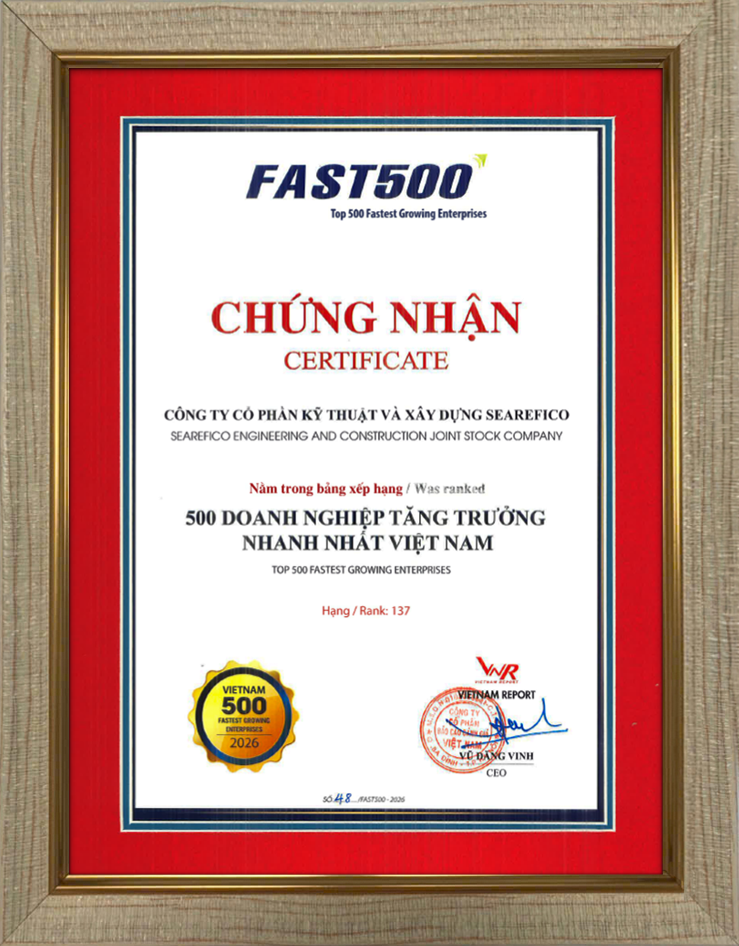 Việc duy trì sự hiện diện trong FAST500 - Top 500 doanh nghiệp tăng trưởng nhanh nhất Việt Nam - minh chứng cho khả năng bứt tốc mạnh mẽ Searefico E&C về doanh thu và hiệu quả kinh doanh ngay cả trong những giai đoạn thị trường đầy biến động.